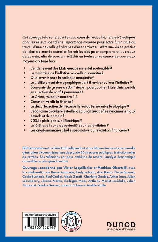 Cet ouvrage éclaire 12 questions au coeur de l’actualité, 12 problématiques dont les enjeux sont d’une importance majeure pour notre futur. Fruit du travail d’une nouvelle génération d’économistes, il offre une vision précise de l’état du monde actuel et fournit les clés pour comprendre les enjeux de demain, afin de pouvoir réfléchir en toute connaissance de cause aux moyens d’y faire face.