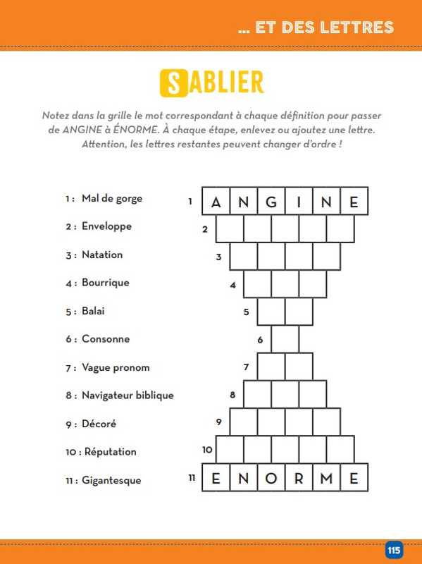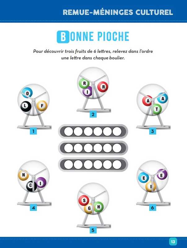 Messages codés, mots coupés, à placer ou à rayer, mêlés, en croix, mémo-quiz, qui suis-je ?, charades, jeux de Kim, des différences ou de loto, tournois de fléchettes, sudokus, images cachées, nombres mystère, étoiles et carrés magiques, ana-fléchés, logigrammes ou logicartes…