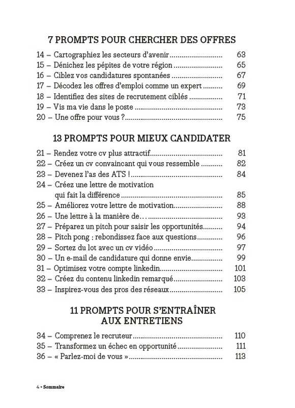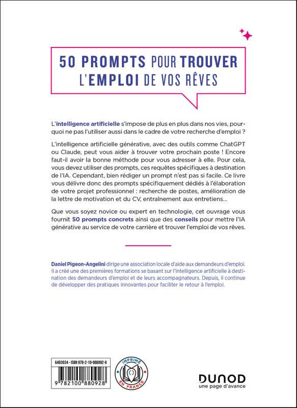 L’intelligence artificielle générative, avec des outils comme ChatGPT ou Claude, peut vous aider à trouver votre prochain poste ! Encore faut-il avoir la bonne méthode pour vous adresser à elle. Pour cela, vous devez utiliser des prompts, ces requêtes spécifiques à destination de l’IA. Cependant, bien rédiger un prompt n’est pas si facile. Ce livre vous délivre donc des prompts spécifiquement dédiés à l’élaboration de votre projet professionnel : recherche de postes, amélioration de la lettre de motivation et du CV, entraînement aux entretiens…