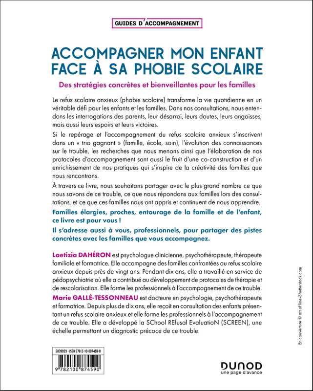 Ce guide d’accompagnement s’adresse à vous, parents, si votre enfant rencontre des difficultés avérées dans la fréquentation de son établissement scolaire ou s’il présente des signes de réticence autour de l’école. Vous avez fait comme vous avez pu jusque-là pour votre enfant, avec ce que vous avez ou aviez comme possibilité, avec les conseils que vous avez reçus ou non. Il ne saurait être question dans ce livre de lister des injonctions. Nous vous proposons des éléments de compréhension de ce trouble pour mieux comprendre ce qui se passe pour lui, pour vous et pour savoir comment expliquer la situation à l’ensemble de vos interlocuteurs (soignants, professionnels de l’éducation, famille, proches).
