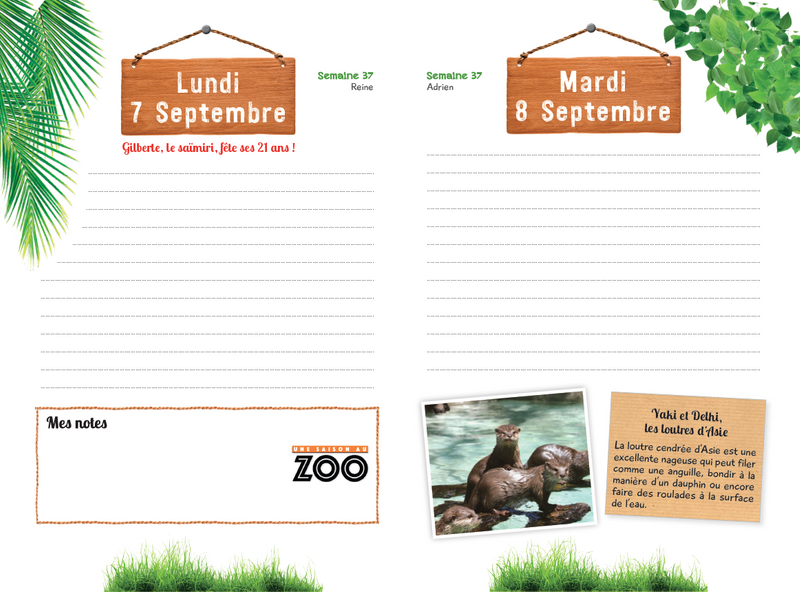 Un agenda aux couleurs de l'émission Une saison au Zoo, avec de superbes photographies, des informations insolites sur les animaux stars de l'émission et leurs dates d'anniversaire, des quiz ludiques et le rappel des Journées internationales consacrées à la défense de la cause animale et aux enjeux environnementaux.