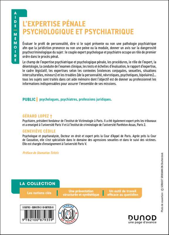 Évaluer le profil de personnalité, dire si le sujet présente ou non une pathologie psychiatrique afin que la juridiction prononce ou non une peine ou la module, donner un avis sur la dangerosité psychocriminologique du sujet : le couple expert psychologue et psychiatre occupe un rôle de premier ordre dans le procès pénal. Le champ de l’expertise psychiatrique et psychologique pénale, les procédures, le rôle de l’expert, la déontologie, la conduite de l’examen clinique, les tests et échelles d'évaluation, le rapport d’expertise, le cadre législatif, les expertises selon les contextes (violences conjugales, sexuelles, situations interculturelles, mineurs) et troubles (de la personnalité, névrotiques, psychotiques, bipolaires)… tous les sujets sont traités dans cet aide mémoire dont l’objectif est de donner au professionnel les informations indispensables pour assurer l’ensemble de ses missions. .