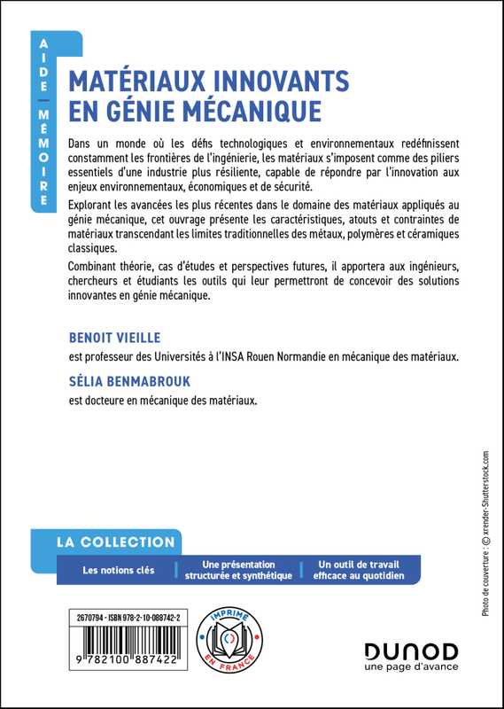 Cet aide-mémoire présente aux ingénieurs, chercheurs et étudiants les principaux matériaux innovants, en détaillant leurs caractéristiques essentielles :
