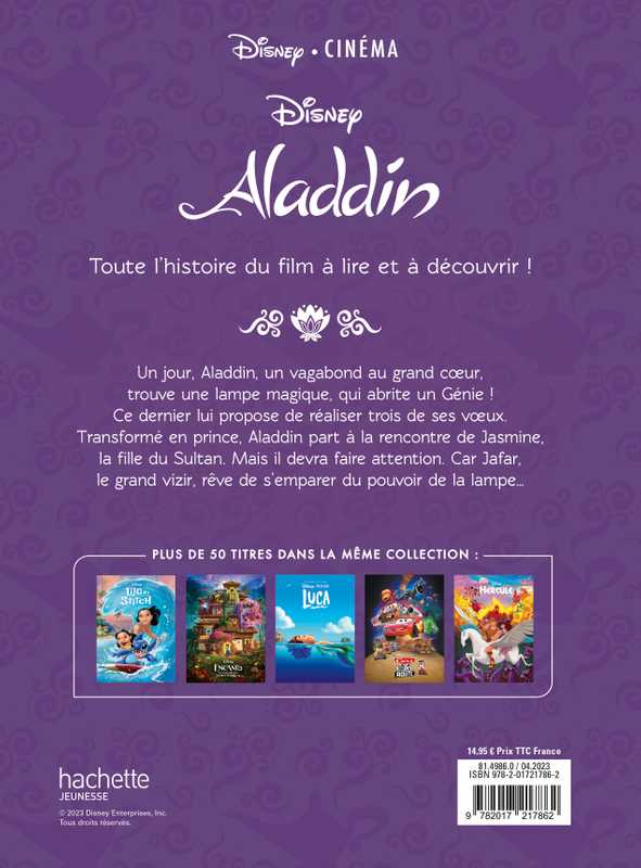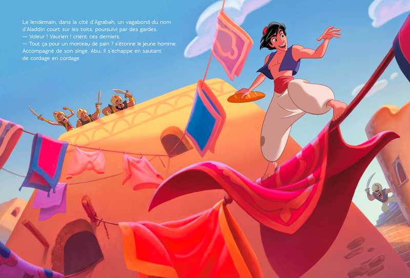Résumé : Dans la cité d’Agrabah, Aladdin, un jeune homme au cœur pur, vit en volant de la nourriture. Mais il rêve d’une vie meilleure, plus honnête et loin des ennuis. Au palais royal, Jafar, un magicien avide de pouvoir et conseiller du Sultan, projette d’épouser la princesse Jasmine. Pour y parvenir, le sorcier a besoin d’une lampe magique. Aladdin, chargé de rapporter l’objet, découvre bientôt que la lampe abrite un fabuleux génie ! Et si le jeune homme tenait là le moyen de changer sa vie ?
