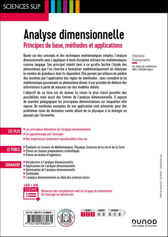 L’objectif de ce livre est de donner la vision la plus claire possible des possibilités mais aussi des limites de l’analyse dimensionnelle. Il expose de manière pédagogique les principales démonstrations sur lesquelles elle repose. De nombreux exemples de son application sont présentés pour des problèmes issus de domaines variés allant de la physique à la biologie. Un dernier chapitre invite le lecteur à réaliser, avec des moyens facilement disponibles et peu onéreux, des expériences pour confronter les résultats des méthodes décrites dans l’ouvrage à des mesures expérimentales réalisables pour la plupart grâce à des applications sur smartphone.
