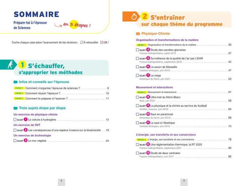 Des fiches mémo, pour réviser l’essentiel, et 36 sujets guidés, classés par thème, qui couvrent tout le programme de sciences (physique-chimie, SVT, technologie).