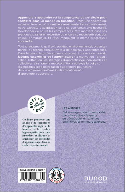 Tout changement, qu’il soit sociétal, environnemental, organisationnel ou technologique, invite à de nouveaux apprentissages. Dans la peau de professionnels, explorez à travers ce livre six facettes essentielles de l’apprentissage (la motivation, l’organisation, l’attention, les stratégies d’apprentissage individuelles et collectives ainsi que la métacognition) et levez le voile sur les blocages liés à notre façon d’apprendre pour entrer dans une dynamique d’amélioration continue afin d’apprendre à apprendre.