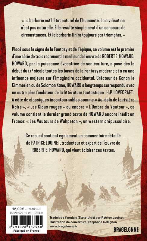 Placé sous le signe de la Fantasy et de l'épique, ce volume est le premier d'une série de trois reprenant le meilleur de l'oeuvre de Robert E. Howard. À côté de classiques incontournables comme « Au-delà de la rivière Noire », « Les Clous rouges » ou encore « L'Ombre du Vautour » (mettant en scène Sonia la Rousse), il contient le dernier grand texte de Howard encore inédit en France: « Les Vautours de Wahpeton », un superbe western crépusculaire.