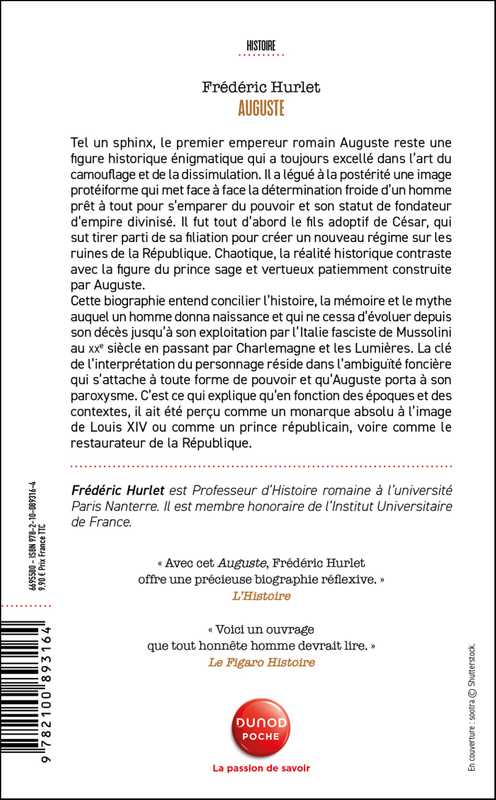Cette biographie entend concilier l’histoire, la mémoire et le mythe auquel un homme donna naissance et qui ne cessa d’évoluer depuis son décès jusqu’à son exploitation par l’Italie fasciste de Mussolini au XXe siècle en passant par Charlemagne et les Lumières. La clé de l’interprétation du personnage réside dans l’ambiguïté foncière qui s’attache à toute forme de pouvoir et qu’Auguste porta à son paroxysme. C’est ce qui explique qu’en fonction des époques et des contextes, il ait été perçu comme un monarque absolu à l’image de Louis XIV ou comme un prince républicain, voire comme le restaurateur de la République.