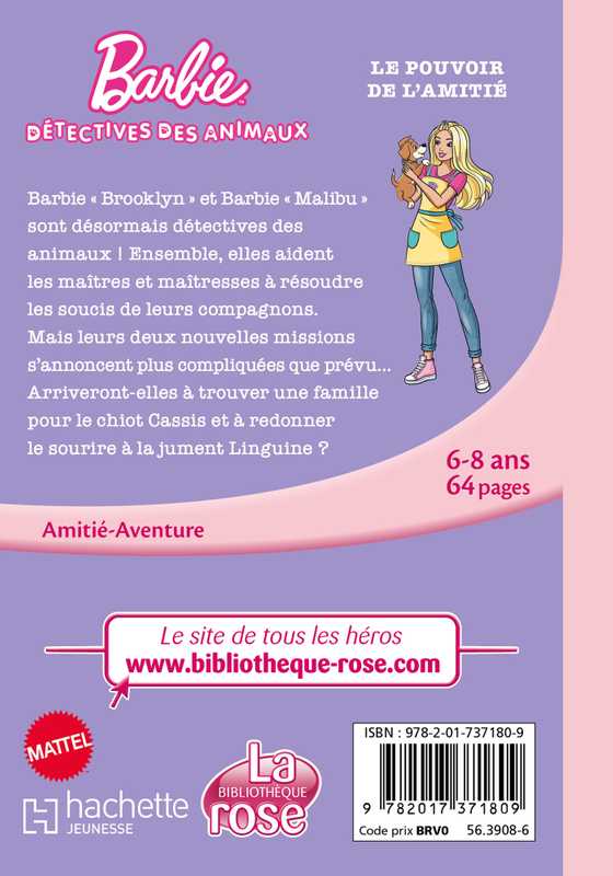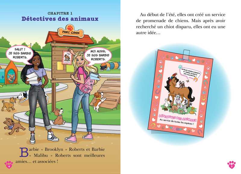Barbie « Brooklyn » et Barbie « Malibu » sont désormais détectives des animaux ! Ensemble, elles aident les maîtres et maîtresses à résoudre les soucis de leurs compagnons. Mais leurs deux nouvelles missions s’annoncent plus compliquées que prévu… Arriveront-elles à trouver une famille pour le chiot Cassis et à redonner le sourire à la jument Linguine ?