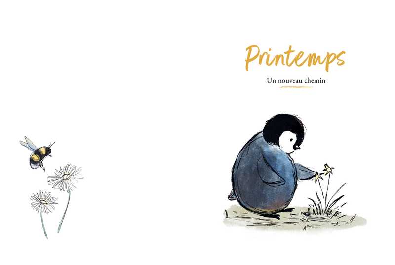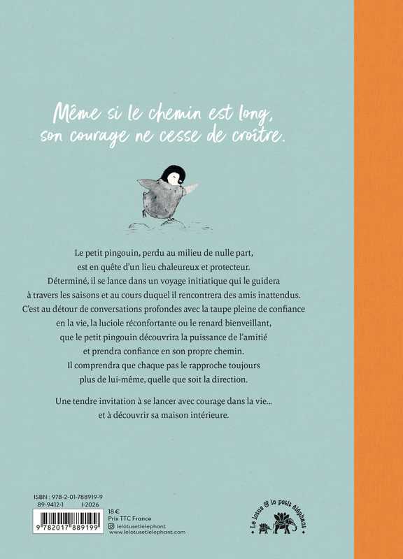 Le petit pingouin, perdu au milieu de nulle part, est en quête d’un lieu chaleureux et protecteur. Déterminé, il se lance dans un voyage initiatique qui le guidera à travers les saisons et au cours duquel il rencontrera des amis inattendus. C’est au détour de conversations profondes avec la taupe pleine de confiance en la vie, la luciole réconfortante ou le renard bienveillant, que le petit pingouin découvrira la puissance de l’amitié et prendra confiance en son propre chemin.