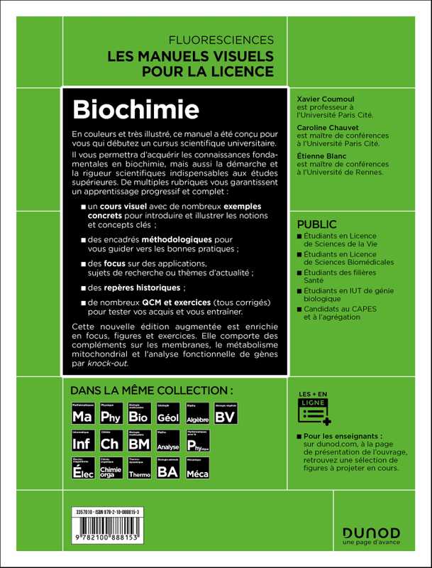 Cette introduction à la biochimie a pour objectif de permettre aux étudiants entrant en Licence de renforcer et d'approfondir leur compréhension conceptuelle des bases de la biochimie. Les concepts abordés sont mis en relation avec des exemples et situations de la vie courante. Les multiples rubriques (encadrés méthodologiques, focus, repères historiques, QCM et exercices corrigés) permettent un apprentissage progressif et complet des connaissances et font de cet ouvrage un support idéal pour l'apprentissage et le parfait compagnon de la classe inversée.