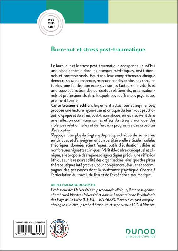 Cette 3ème édition actualisée présente, de manière synthétique et pédagogique, ces deux troubles cliniques que sont le burn-out (ou fatigue chronique) et le stress post-traumatique (TSPT). Illustré de nombreux cas cliniques, elle est à jour des dernières recherches scientifiques menées en psychologie sur ces thèmes.