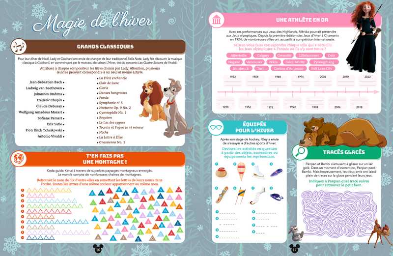 Plongez dans la magie des univers Disney et affrontez vaillamment les quiz et jeux qui vous attendent dans ces pages. Quiz visuels, énigmes, mots croisés, jeux autour de la langue française, de l’histoire, de la musique ou du cinéma... Il y en a pour tous les goûts et tous les âges !