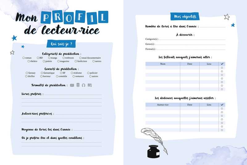 Ouvrez les pages de ce très bel ouvrage pour créer votre profil de lecteur-ice, fixer des objectifs et des défis stimulants, noter vos playlists littéraires et crushs du moment, suivre chaque livre emprunté, prêté, acheté ou à lire grâce à des trackers pratiques, rédiger vos avis détaillés et vous émerveiller par votre progression.