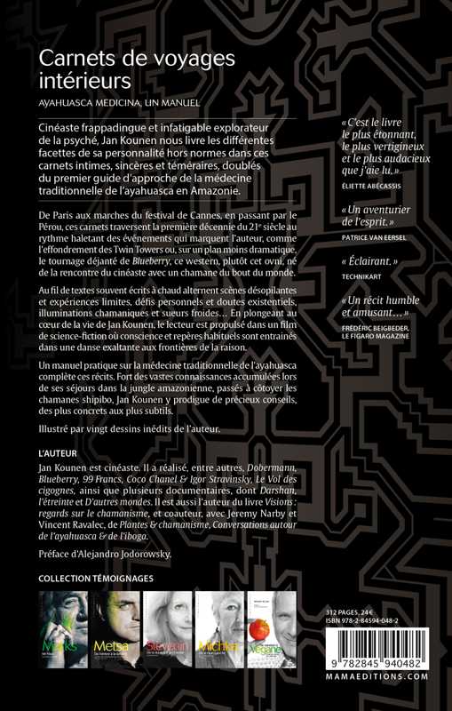 De Paris aux marches du festival de Cannes, en passant par le Pérou, ces carnets traversent la première décennie du XXIe siècle au rythme haletant des événements qui marquent l'auteur, comme l'effondrement des Twin Towers ou, sur un plan moins dramatique, le tournage déjanté de Blueberry, ce western, plutôt cet ovni, né de la rencontre du cinéaste avec un chamane du bout du monde.Au fil de textes souvent écrits à chaud alternent scènes désopilantes et expériences limites, défis personnels et doutes existentiels, illuminations chamaniques et sueurs froides... En plongeant au coeur de la vie de Jan Kounen, le lecteur est propulsé dans un film de science-fiction où conscience et repères habituels sont entraînés dans une danse exaltante aux frontières de la raison.Un manuel pratique sur la médecine traditionnelle de l'ayahuasca complète ces récits. Fort des vastes connaissances accumulées lors de ses séjours dans la jungle amazonienne, passés à côtoyer les chamanes shipibo, Jan Kounen y prodigue de précieux conseils, des plus concrets aux plus subtils.Illustré par 20 dessins inédits de l'auteur.