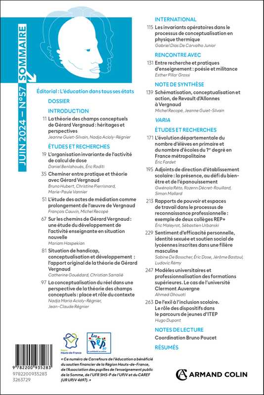 La revue Carrefours de l'éducation constitue un lieu de convergence et de confrontation où peuvent s'exprimer les principaux axes disciplinaires constitutifs des sciences de l'éducation : psychologie, philosophie, histoire et sociologie de l'éducation, didactiques. Une perspective comparative et/ou internationale est toujours présente dans plusieurs articles au sein des différentes rubriques proposées dans chaque numéro (études et recherches, international, notes de synthèse) organisées en dossiers thématiques et/ou varia. Cette double articulation fait de la revue un carrefour des perspectives en éducation.