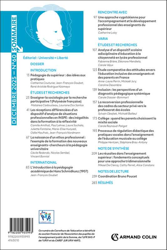 La revue Carrefours de l'éducation constitue un lieu de convergence et de confrontation où peuvent s'exprimer les principaux axes disciplinaires constitutifs des sciences de l'éducation : psychologie, philosophie, histoire et sociologie de l'éducation, didactiques. Une perspective comparative et/ou internationale est toujours présente dans plusieurs articles au sein des différentes rubriques proposées dans chaque numéro (études et recherches, international, notes de synthèse) organisées en dossiers thématiques et/ou varia. Cette double articulation fait de la revue un carrefour des perspectives en éducation.