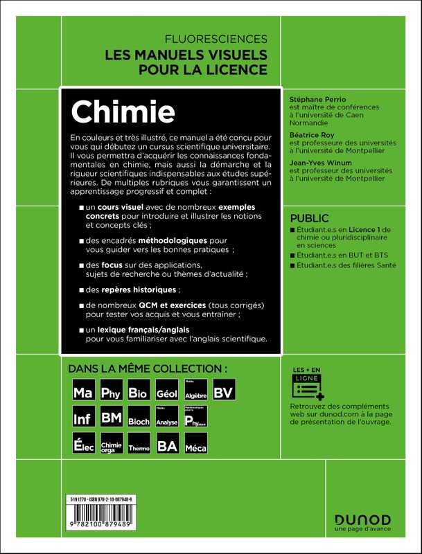 En couleurs et très illustré, ce livre est le compagnon de l'étudiant en première année d'études supérieures. Il lui permet d'assimiler des connaissances fondamentales en chimie. Il propose un cours très structuré, des rubriques « Rappels », « Définitions », « Éléments historiques », « Méthodologie ».... Des ressources numériques pour les étudiants et les enseignants sont téléchargeables sur dunod.com.
