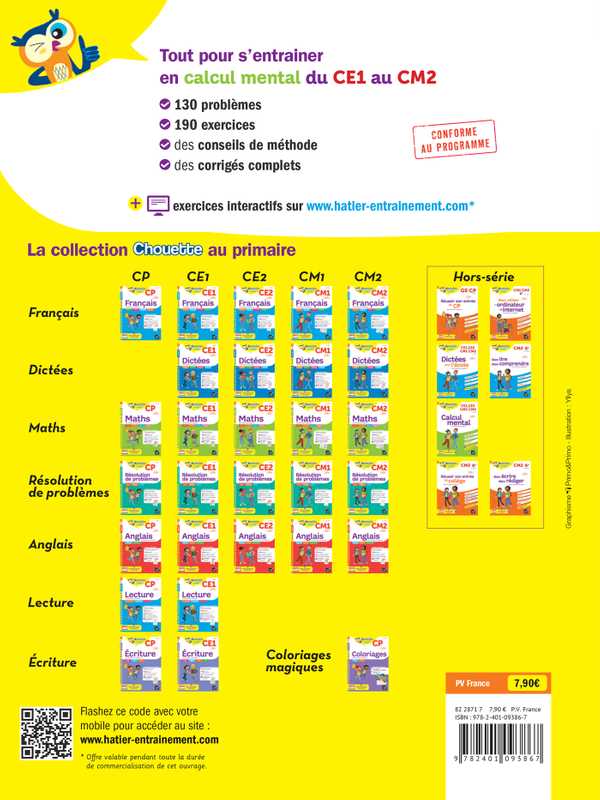 Pour un entrainement systématique en calcul mental du CE1 au CM2 : 190 exercices progressifs, 130 problèmes, des conseils de méthode, des énigmes, des jeux et des corrigés complets.