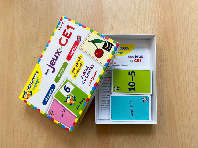 Des jeux de cartes CE1 pour s'entrainer en lecture, maths et anglais tout en s'amusant. Avec 120 cartes, 9 règles du jeu, pour 1 à 4 joueurs.