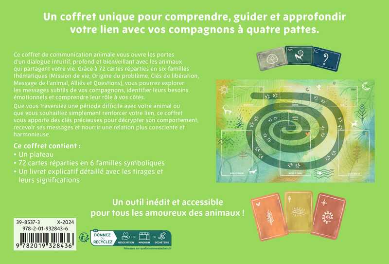 Ce coffret de communication animale vous ouvre les portes d’un dialogue intuitif, profond et bienveillant avec les animaux qui partagent votre vie. Grâce à 72 cartes réparties en six familles thématiques (Mission de vie, Origine du problème, Clés de libération, Message de l’animal, Alliés et Questions), vous pourrez explorer les messages subtils de vos compagnons, identifier leurs besoins émotionnels et comprendre leur rôle à vos côtés.