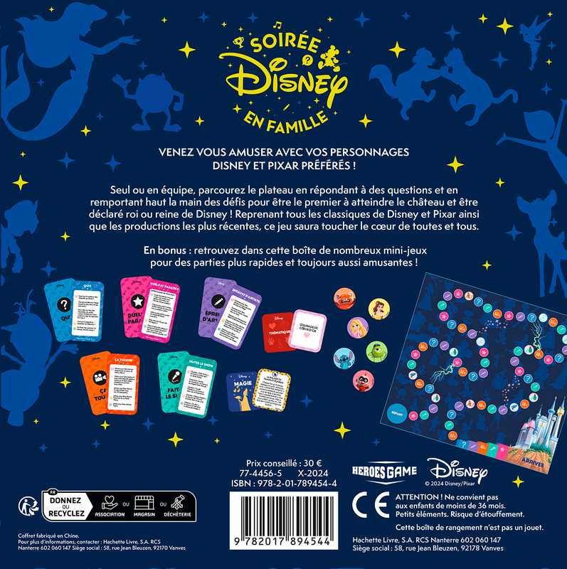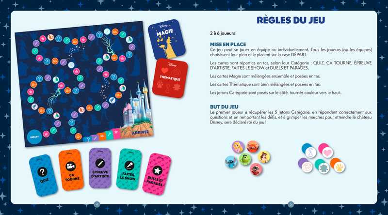 Seul ou en équipe, parcourez le plateau en répondant à des questions et en remportant haut la main des défis pour être le premier à atteindre le château et être déclaré roi ou reine de Disney ! Reprenant tous les classiques de Disney et Pixar ainsi que les productions les plus récentes, ce jeu saura toucher le coeur de toutes et tous.
