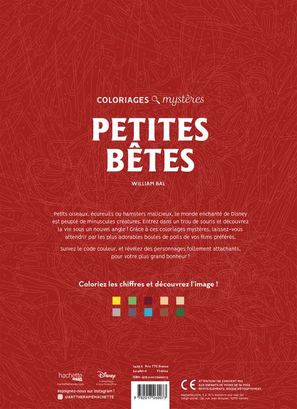 Petits oiseaux, écureuils ou hamsters malicieux, le monde enchanté de Disney est peuplé d’adorables créatures. Entre dans un trou de souris pour voir la vie sous un nouvel angle ! Grâce à ces coloriages mystères, laisse-toi attendrir par les plus adorables boules de poils de tes films préférés. Suis le code couleur, et révèle des personnages follement attachants, pour ton plus grand bonheur !
