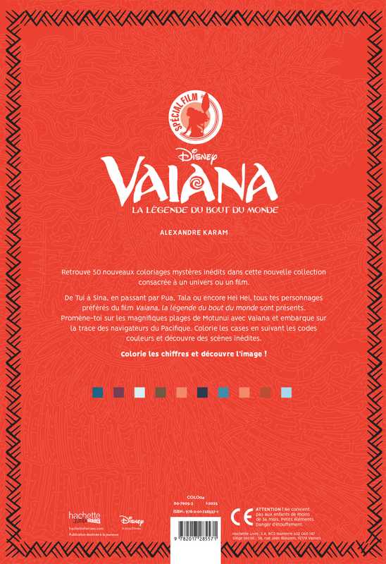 Retrouve 50 nouveaux coloriages mystères inédits dans cette nouvelle collection consacrée à un univers ou un film. De Tui à Sina, en passant par Pua, Tala ou encore Hei Hei, tous les personnages incontournables du film Vaiana, la légende du bout du monde sont présents. Balade-toi sur les magnifiques plages de Motunui avec Vaiana et embarque sur la trace des navigateurs du Pacifique.