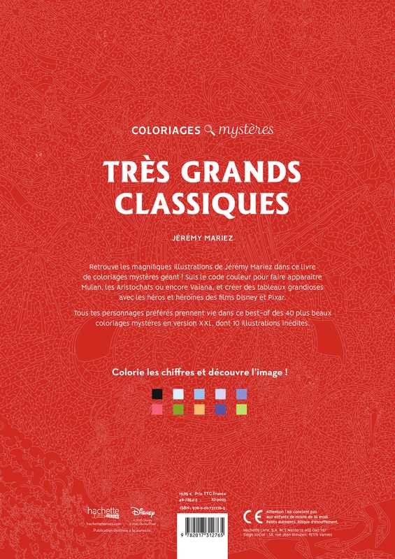 Retrouve les magnifiques illustrations de Jérémy Mariez dans ce livre de coloriages mystères géant (format 28,3x40 cm) ! Suis le code couleur pour faire apparaître Vaiana, les Aristochats ou encore Mulan, et crée des tableaux grandioses avec tes personnages Disney et Pixar préférés.
