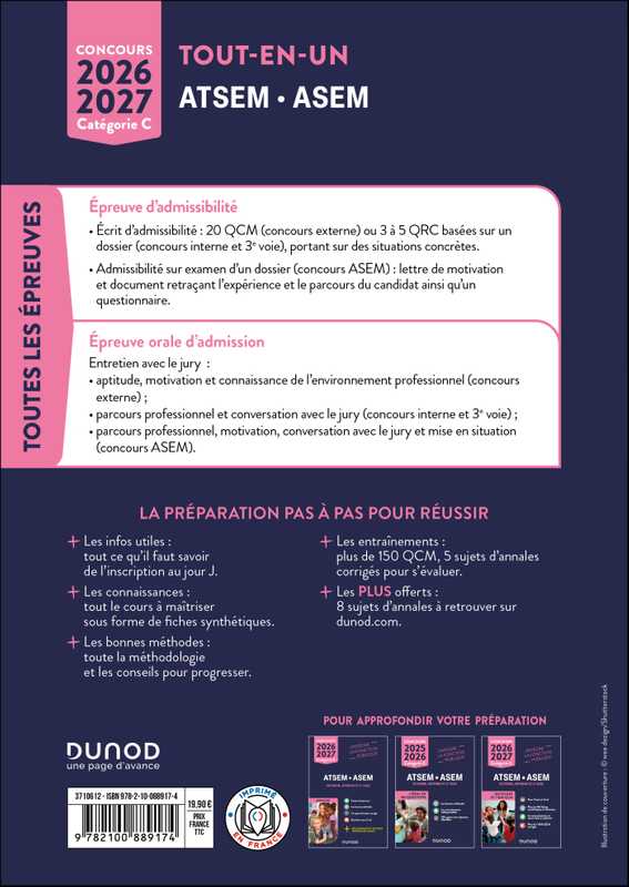 Cet ouvrage propose une préparation complète aux épreuves des concours externe, interne ou de 3e voie d’Agent Territorial Spécialisé des Écoles Maternelles de la fonction publique territoriale (ATSEM) ou de la Ville de Paris (ASEM).