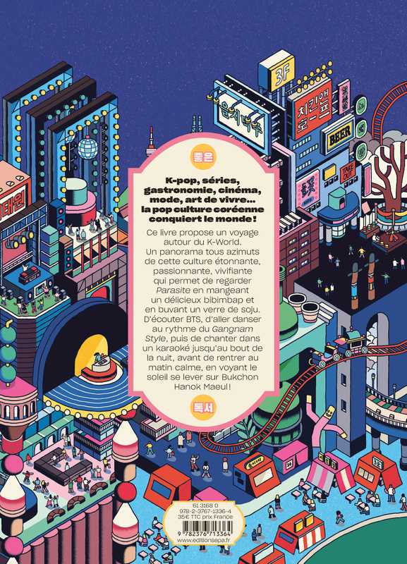 Ce livre propose un voyage autour du K-World. Un panorama tous azimuts de cette culture passionnante, étonnante, vivifiante, qui permet de regarder Parasite en mangeant un délicieux Bibimbap et en buvant un verre de soju. D’écouter BTS, d’aller danser au ryhtme du Gangnam style, puis de chanter dans un karaoké jusqu’au bout de la nuit avant de rentrer au matin calme en voyant le soleil se lever sur Bukchon Hanok Maeul !
