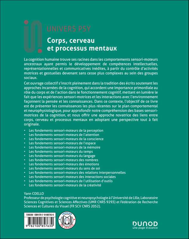 Ce livre rassemble les avancées scientifiques les plus récentes sur les liens entre fonctionnement sensorimoteur et cognition. Il couvre les champs scientifiques abordés classiquement en psychologie et neurosciences cognitives, tels que la perception, la mémoire, la conscience, l’attention, les représentations spatiales, la communication, la cognition sociale, les émotions, le langage, la cognition numérique, le raisonnement, l’intelligence artificielle et la créativité.