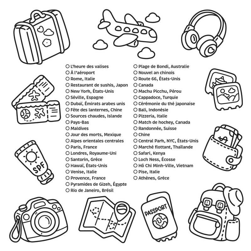 Choisissez vos plus belles palettes et laissez-vous porter page après page : dégustez de véritables sushis japonais, photographiez la statue de la Liberté, dansez sous le soleil hawaïen, partagez une pizza en Italie…