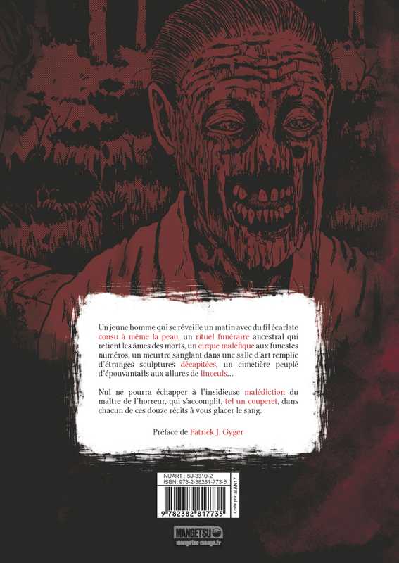 Junji Ito montre l'étendue de son talent horrifique à travers 12 nouvelles, dont Frissons et Le Vieux Vinyle présents dans le tome 1 des Chefs-d'oeuvre. Cette édition bénéficie d'une préface de Patrick J. Gyger et d'une analyse en fin d'ouvrage par Morolian, spécialiste francophone de l'auteur.