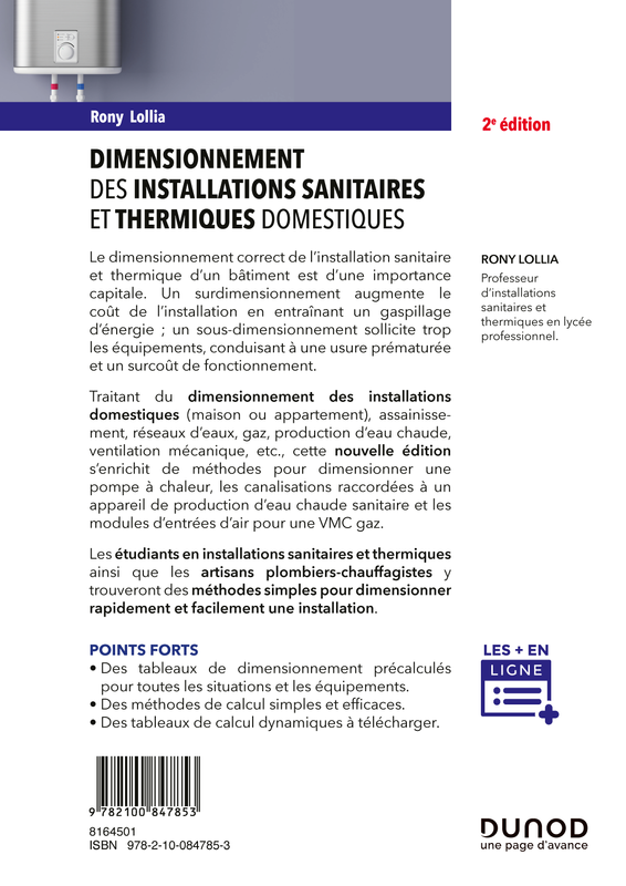 Traitant du dimensionnement des installations domestiques (maison ou appartement), assainissement, réseaux d’eaux, gaz, production d’eau chaude, ventilation mécanique, etc., cette nouvelle édition s’enrichit de méthodes pour dimensionner une pompe à chaleur, les canalisations raccordées à un appareil de production d’eau chaude sanitaire et les modules d’entrées d’air pour une VMC gaz.