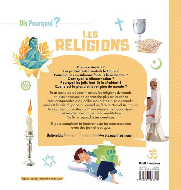 | Plus de 150 questions-réponses pour expliquer et faire découvrir différentes religions aux enfants : catholicisme, judaïsme, islam, bouddhisme, hindouisme... : Combien y a-t-il de religions dans le monde ? Pourquoi la Torah est-elle présentée comme un rouleau ? Quel est le dieu des bouddhistes ? Qui était Abraham ? Jésus a-t-il vraiment existé ? Peut-on représenter Dieu ? C'est quoi, la laïcité ? Qui a inventé les religions ? Et bien d'autres sujets encore… |