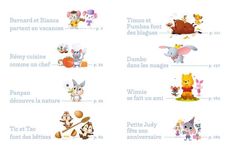 Contient : Bernard et Bianca partent en vacances ; Rémy cuisine comme un chef ; Panpan découvre la nature ; Tic et Tac font des bêtises ; Timon et Pumbaa font des blagues ; Dumbo dans les nuages ; Winnie se fait un ami ; Petite Judy fête son anniversaire.