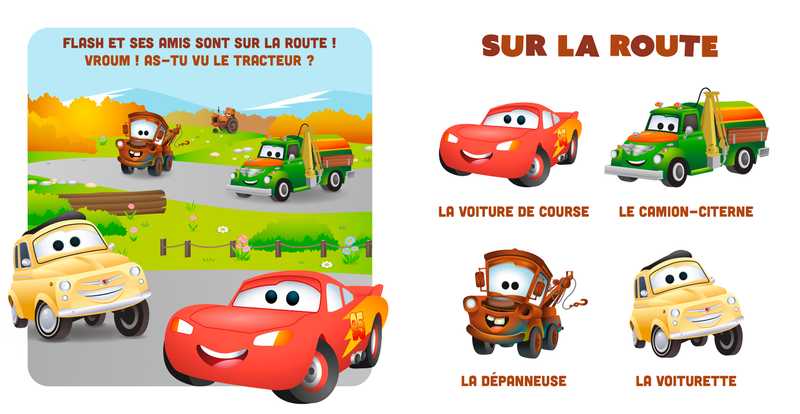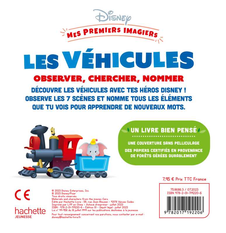 Dans cet imagier richement illustré, guidez votre enfant dans ses premiers apprentissages tout en l’amusant. Faites-lui découvrir les véhicules avec ses personnages Disney préférés : aidez-le à observer les scènes, à repérer les éléments et à les nommer.