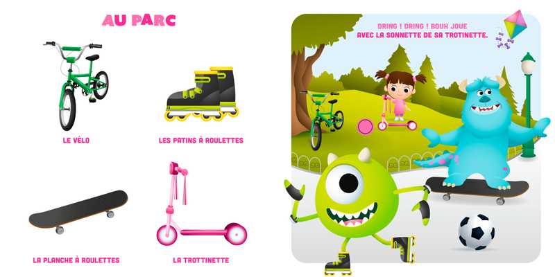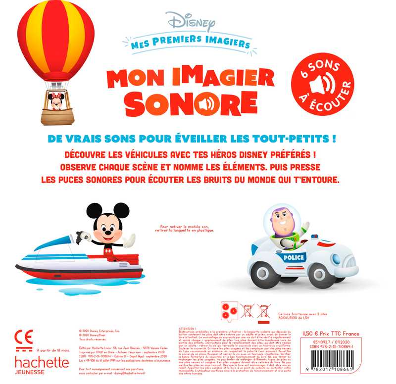 Dans cet imagier richement illustré, guidez votre enfant dans ses premiers apprentissages tout en l’amusant. Faites-lui découvrir les véhicules avec ses personnages Disney préférés : aidez-le à observer les scènes, à repérer les éléments et à les nommer. Des puces sonores pour combiner deux sens : la vue et l'audition.