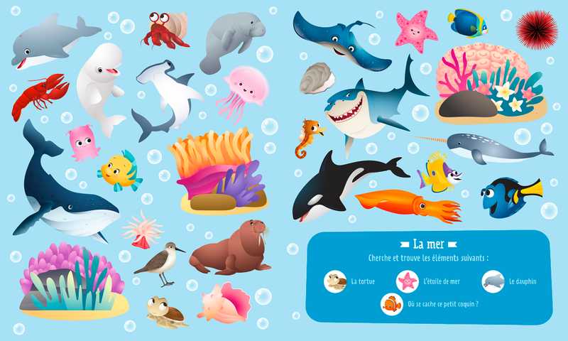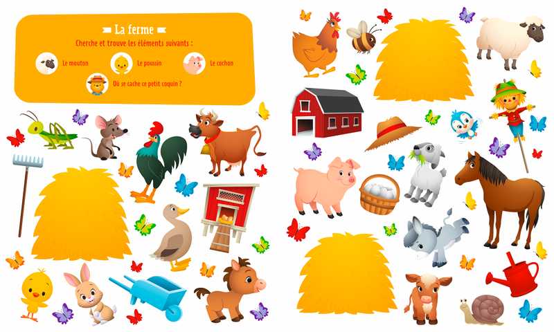- Des illustrations avec, sur chaque scène, un encadré avec une miniature de l’élément caché pour guider l’enfant dans sa recherche ;