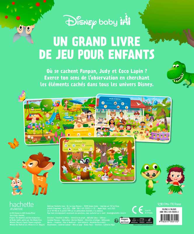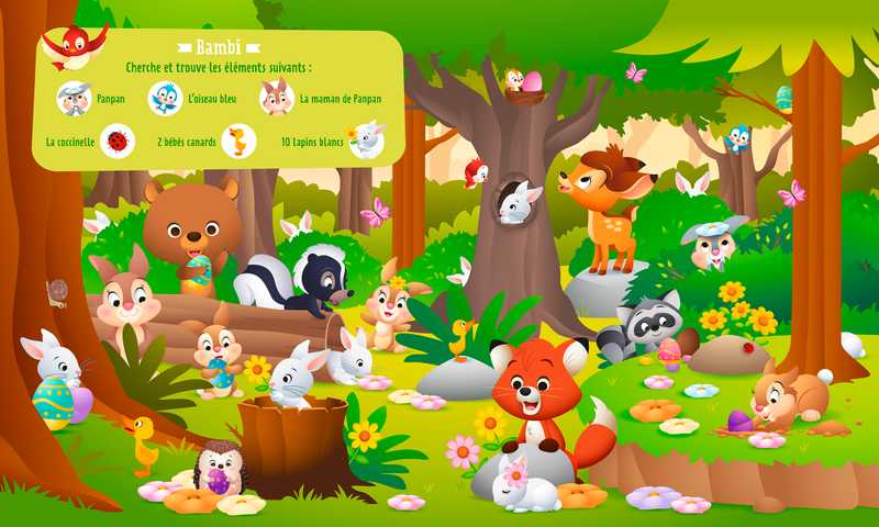 - 9 scènes de cherche et trouve, qui fourmillent de détails pour débusquer les personnages, mais aussi de nombreux lapins cachés dans les décors !