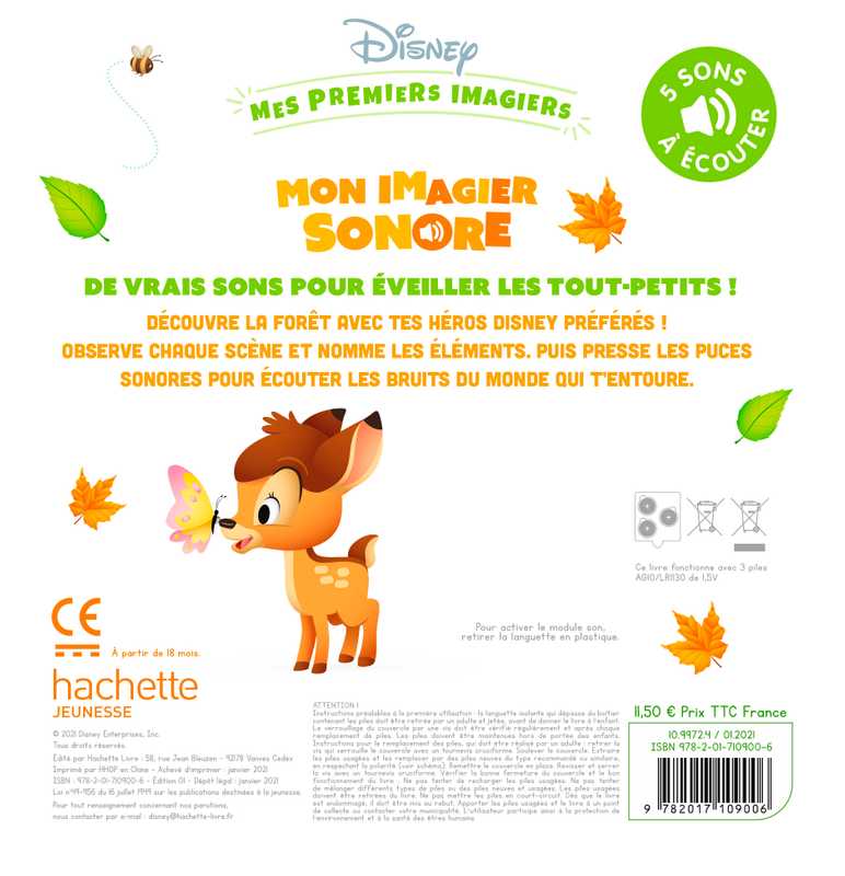 Dans cet imagier richement illustré, guidez votre enfant dans ses premiers apprentissages tout en l’amusant. Faites-lui découvrir la forêt avec ses personnages Disney préférés : aidez-le à observer les scènes, à repérer les éléments et à les nommer. Des puces sonores pour combiner deux sens : la vue et l'audition.