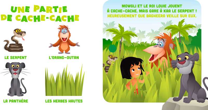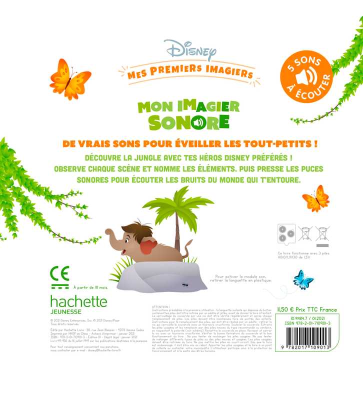 Dans cet imagier richement illustré, guidez votre enfant dans ses premiers apprentissages tout en l’amusant. Faites-lui découvrir la jungle avec ses personnages Disney préférés : aidez-le à observer les scènes, à repérer les éléments et à les nommer. Des puces sonores pour combiner deux sens : la vue et l'audition.