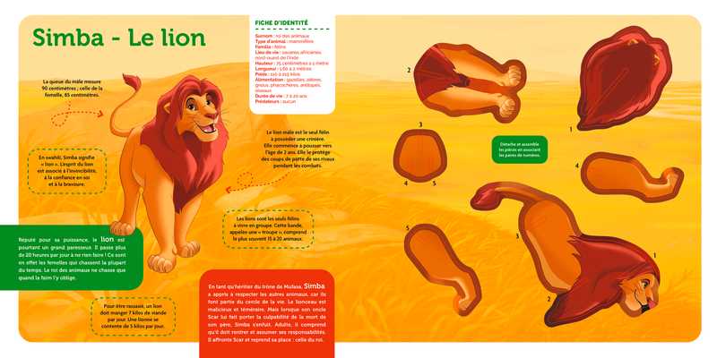 - Des fiches de présentation des personnages pour tout savoir sur eux et leur espèce : de l’alimentation du lion à la vision nocturne du tigre, en passant par les caractéristiques physiques du dragon !