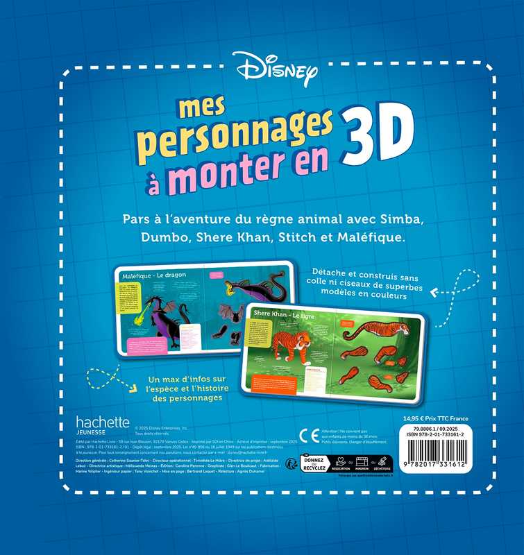 - Cinq doubles pages sur cinq personnages Disney différents : Simba, le courageux lion ; Dumbo, l’adorable éléphanteau ; Shere Khan, le redoutable tigre ; Stitch, l’incontrôlable alien et Maléfique, le terrifiant dragon !