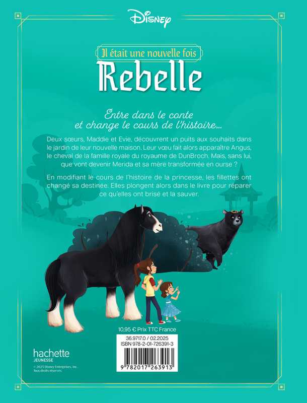 Résumé : Entre dans le conte et change le cours de l’histoire… Deux sœurs, Maddie et Evie, découvrent un puits aux souhaits dans le jardin de leur nouvelle maison. Leur vœu fait alors apparaître Angus, le cheval de la famille royale du royaume de DunBroch. Mais, sans lui, que vont devenir Merida et sa mère transformée en ourse ? En modifiant le cours de l’histoire de la princesse, les fillettes ont changé sa destinée. Elles plongent alors dans le livre pour réparer ce qu’elles ont brisé et la sauver.