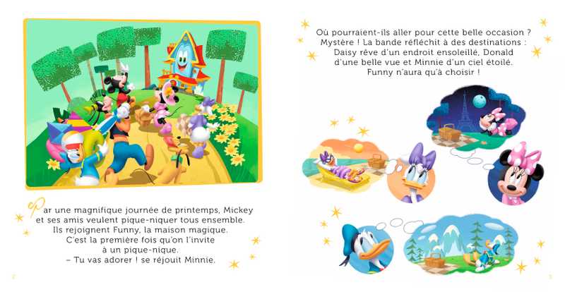 Histoire : Par une belle journée de printemps, Mickey et ses amis veulent organiser un pique-nique. Funny la maison magique doit choisir le lieu idéal où déposer ses amis. Mais, la maison n’arrête pas d’éternuer, et Mickey, Minnie, Donald, Daisy, Dingo et Pluto sont projetés dans des endroits improbables ! Comment pourront-ils arrêter Funny ?