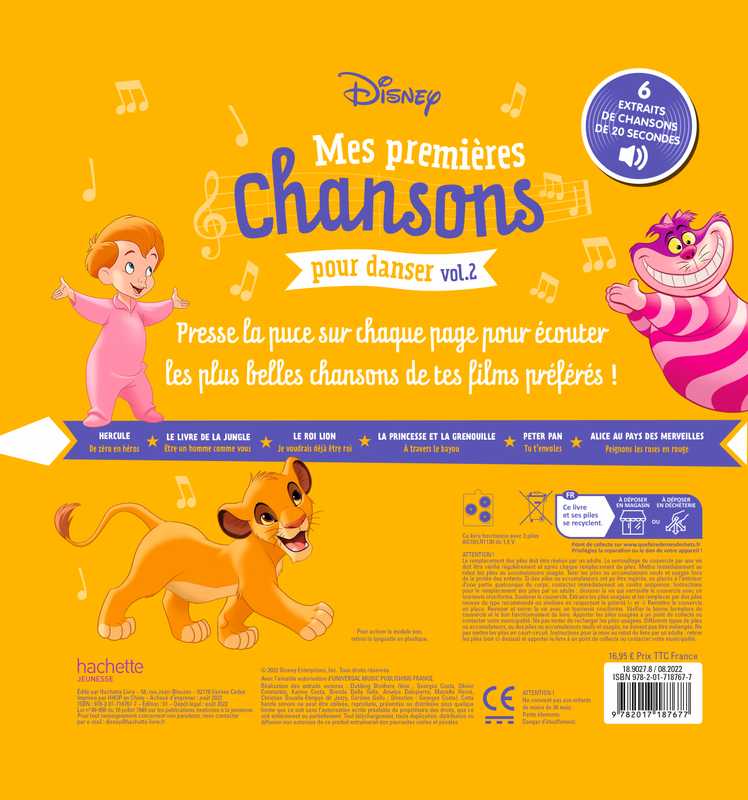Sur chaque page, l'enfant recherche dans l'illustration le petit bouton qui déclenchera la chanson. Une illustration simple et tendre accompagne chaque chanson mythique Disney et invite à découvrir l'univers magique de chaque film : Hercule, Le Livre de la Jungle, Le Roi Lion, La Princesse et la Grenouille, Peter Pan, Alice au Pays des Merveilles.