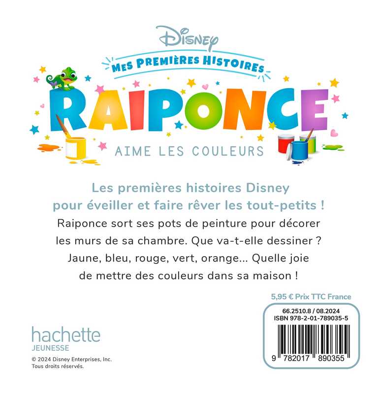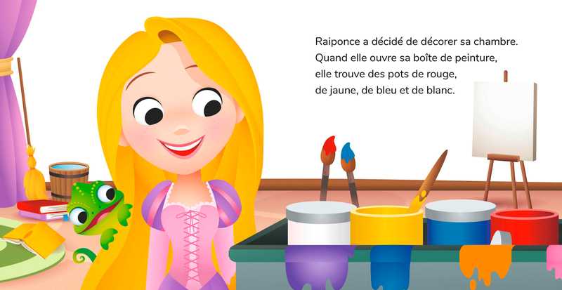 – Résumé : Raiponce sort ses pots de peinture pour décorer les murs de sa chambre. Que va-t-elle dessiner ? Jaune, bleu, rouge, vert, orange... Quelle joie de mettre des couleurs dans sa maison !